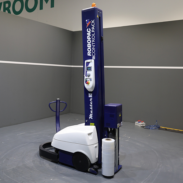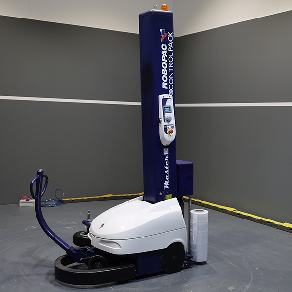 Para adaptarse a la carga a envolver, el robot Master 110 utiliza una rueda palpadora y distribuye el film estirable mediante un carro porta bobinas con freno de embrague mecánico. Una fotocélula en el portabobinas lee la altura de la carga y ajusta automáticamente el ciclo de envoltura. Su timón facilita el desplazamiento de un palet a otro, y su sencillez de uso lo convierte en una herramienta universal para el empaquetado.